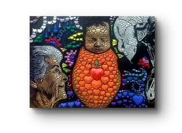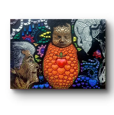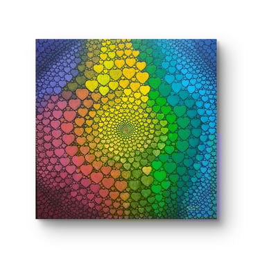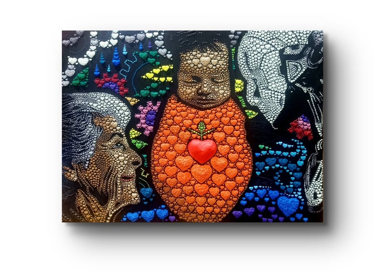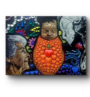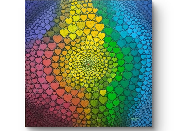 This artwork, titled "Nang Pasimula" ("In the Beginning"), is a vibrant interpretation of creation. The painting is meticulously crafted from countless heart shapes in a radiant spectrum of colors, all spiraling towards a single red heart at the center. This composition visually signifies the beginning of everything, illustrating how all things originated from the overflowing love of God. Representing the opening words of the Bible, this piece is foundational for the artist; it was his first intentional work using the "Heart Pointillism" style to make Faith the primary subject.