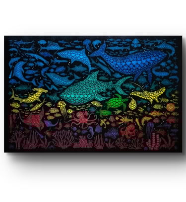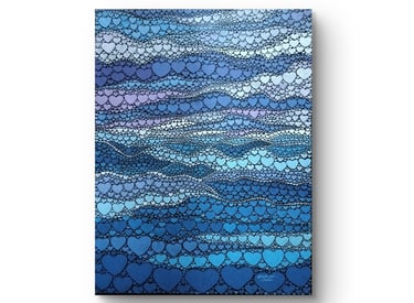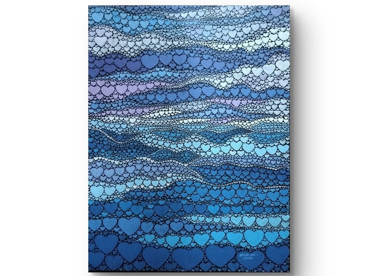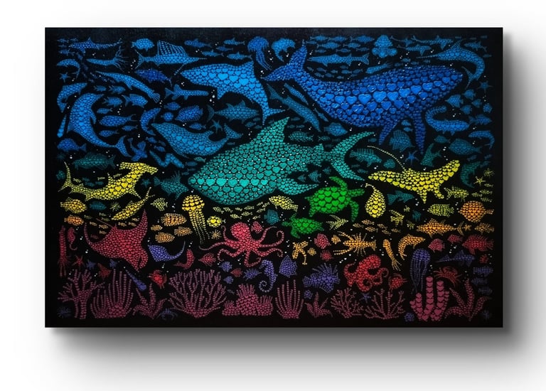 The painting conveys a powerful message of ocean conservation by depicting sea creatures within heart shapes. This symbolic representation emphasizes the need for love and responsibility in preserving marine life and protecting coral reefs. The heart shapes serve as both a visual appeal and a reminder that our actions should stem from a genuine affection for the oceans, urging viewers to become stewards of the sea.